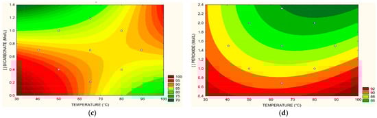 As a result of the statistical analysis, the respective equations were obtained to determine the optimal conditions for the statistical analysis. In each equation presented in Table 4, T corresponds to the temperature (°C), P to the H2O2 concentration (Molar), B to the HCO3 concentration (Molar), and Z to the removal efficiency (%).