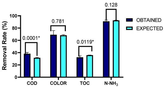 From Equations (1)–(12), the optimum conditions were calculated for achieving the highest removal efficiencies. These conditions were 1 M of HCO3, 2 M of H2O2 at 35%, and 60 °C of temperature. Figure 9 shows the validation results between the expected value yielded by the experimental design and those obtained experimentally using six repetitions. To determine statistical significance, multiple t-tests were used for data 1, using the Holm Sidak method, with alpha = 0.05. Each row was analyzed individually without assuming a consistent SD number of t-tests: 6. It was found that there are significant differences between what was obtained experimentally and what was expected for the TOC and COD tests. However, it was found that the value was higher in what was obtained experimentally compared to what was expected. This made it possible to establish that the operating conditions obtained were optimal to get the highest removal values for each parameter evaluated.