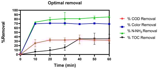 Figure 10 shows the removal kinetics of the optimal H2O2 and bicarbonate process, where the behavior of the COD, TOC, color, and N-NH3 parameters was analyzed every 10 min.