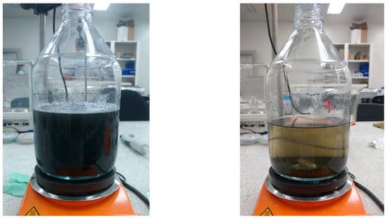 (left) The coloration of residual water from dyeing without treatment, (right) the coloration of residual water from dyeing after treatment (60 min).