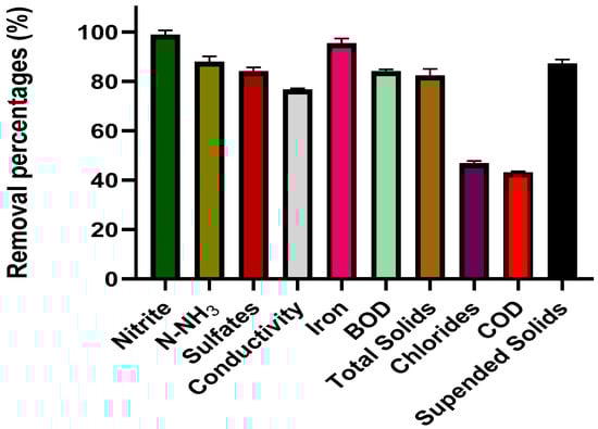 Another critical factor in eliminating dyes in textile waters is pH; it has been estimated that at a pH of 4.5 to 7.3, the bicarbonate ions released interact with the dyes allowing their degradation [,]. About the other pollutants, it was found that the removal was above 80% (nitrites, N-NH3, sulfates, iron, BOD, total solids, and suspended solids); for the other parameters evaluated in the characterization, the removal was between 42% and 77% as shown in Figure 13; it is essential to note that all the concentration and removal values obtained comply with the current regulations for the discharge of this type of wastewater.