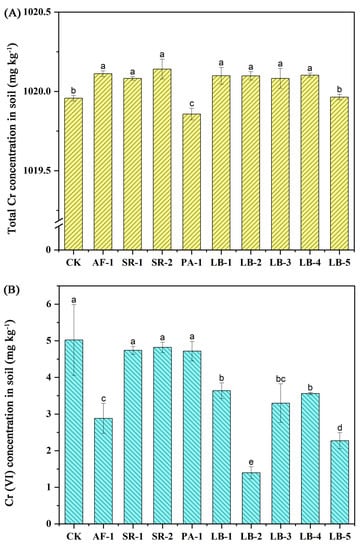 - Arshad, M.; Khan, A.H.A.; Hussain, I.; Anees, M.; Iqbal, M.; Soja, G.; Linde, C.; Yousaf, S. The reduction of Cr (VI) phytotoxicity and phytoavailability to wheat (Triticum aestivum L.) using biochar and bacteria. Appl. Soil Ecol. 2018, 114, 90–98. [Google Scholar] [CrossRef]