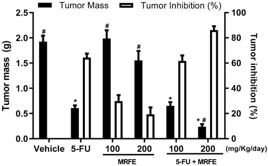 In vivo antitumor effect of 5-FU 25 mg/kg/day associated with MRFE 200 mg/kg/day in animals transplanted with sarcoma 180. The vehicle group was treated with saline and the 5-FU group with 5-Fluorouracil 25 mg/kg/day. The values correspond to the mean ± S.E.M. of 07 animals/group analyzed using one-way analysis of variance with the Student–Newman–Keuls post test. * p< 0.05 compared to the vehicle group. # p < 0.05 compared to the 5-FU group.