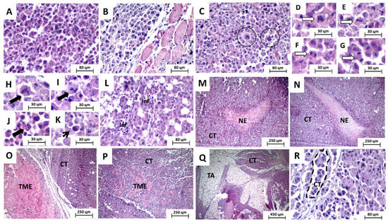 Photomicrographs of HE-stained histological sections of surgical specimens of sarcoma 180 implanted in rodents. Circles—giant tumor cells with bizarre nuclei; white arrows—typical mitotic figures; dark arrows—atypical figures; thin arrow—apoptotic bodies; dashed line—presence of tumor cell emboli within blood vessels A-C, Rx400, D-K x800, and M-Q x100. Caption: CT—viable tumor cells; NE—coagulative necrosis; TME—skeletal striated muscle tissue; TA—subcutaneous adipose tissue. (A,B) prominent nucleoli; (C) tumor giant cells with hyperchromatic misshapen nuclei; (D) prophase; (E) metaphase; (F) anaphase; (G) telophase; (H) atypical tripolar spindles; (I) atypical tetrapolar spindles; (J) atypical prophases; (K) apoptotic bodies; (M,N) comedo-type necrosis; (L) peri and intratumoral inflammatory infiltrate rich in lymphocytes; (O) tumor cells compressing the peripheral skeletal muscle tissue; (P) tumor cells invading and dissociating skeletal muscle tissue; (Q) tumor cells permeating and disorganizing the subcutaneous adipose tissue; (R) tumor cell emboli within blood vessels.