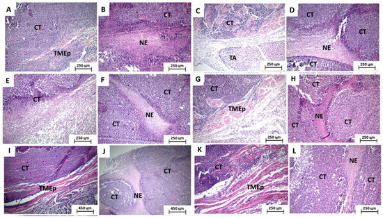 Photomicrographs of HE-stained histological sections of surgical specimens of sarcoma 180 implanted in rodents. (A) vehicle group showing tumor with infiltrative and irregular margins, invading and dissociating peripheral muscle tissue and (B) forming solid intraparenchymal blocks of coagulative necrosis. (C) 5-FU group showing regular tumor margins, with a more expansive growth pattern and (D) thin bands of coagulative necrosis forming a trabecular pattern. (E) Group treated with 100 mg/kg of the extract showing very infiltrative tumor margins and (F) forming thick intraparenchymal bands of coagulative necrosis. (G) Group treated with 200 mg/kg showing much more regular tumor margins and (H) trabeculae of intratumoral coagulative necrosis. (I,J) Group treated with 5-FU associated with 100 mg/Kg and (K,L) 200 mg/kg of the extract exhibiting regular tumor margins compressing peripheral skeletal striated muscle tissue and thin trabeculae of intratumoral coagulative necrosis. Caption: CT—viable tumor cells; NE—coagulative necrosis; TMEp—skeletal striated muscle tissue; TA—subcutaneous adipose tissue (×100).