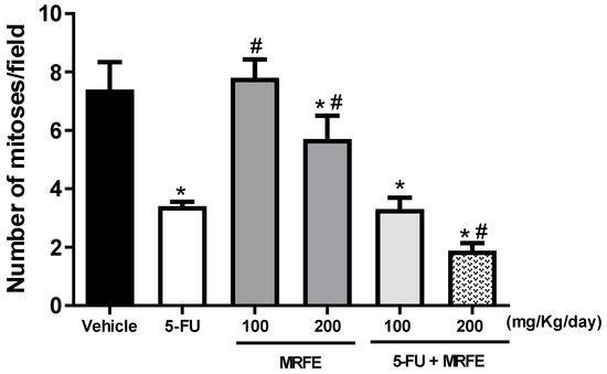 Quantitative analysis of the mean mitosis/histological field (×400) for the different experimental groups. Data expressed as mean ± S.E.M. Data analyzed by one-way analysis of variance (ANOVA) with Tukey post test. * p < 0.05 compared to the vehicle group. # p < 0.05 compared to the 5-FU group.