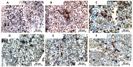 Photomicrographs of histological sections demonstrating immunohistochemical expression of the Ki67 antigen (brownish staining) in the tumors analyzed. The tumor cells presented predominantly nuclear positivity (LSAB, 400×). (A) vehicle group; (B) 5-FU group; (C) MRFE 100 group; (D) MRFE 200 group; (E) 5-FU+MRFE 100 group; (F) 5-FU+MRFE 200 group.