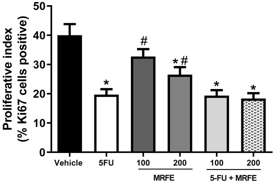 In the quantitative analysis of the proliferative index, the number of Ki67-positive cells, interpreted as cycling cells, was significantly lower in the groups treated with isolated 5-FU (19.6 ± 1.9 %), MRFE 200 (26.5 ± 26.0%), 5-FU associated with MRFE 100 (9.33 ± 1.9%), and 5-FU associated MRFE 200 (18.33 ± 1.8%) than in the vehicle-only group (40.0 ± 3.8). However, there was no difference in the cellular proliferative index between the vehicle group and the MRFE 100 group (32.7 ± 2.5%) (Figure 6). Quantitative analysis of in situ Ki67 antigen immunoexpression has been used to evaluate the biological behavior of tumors in preclinical experiments associated with the antitumor activity of natural substances in research with sarcoma 180 [31,32].