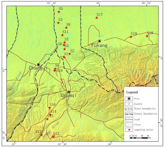 The sampling was conducted in autumn, 2019.Three study areas around Urumqi city (northern Urumqi, southern Urumqi, and Fukang) were chosen with different soil properties and crops types. As shown in Figure 1, soil samples of 19 crop types were collected and marked 1S (Site 1)–19S (Site 19), respectively. The crops in the northern Urumqi region are mainly sweet potatoes, corn, cotton, and greenhouse vegetables. The crops in the southern Urumqi region are mainly potatoes, onion, flowers, and greenhouse vegetables. The crops in Fukang are mainly cotton and corn. Soil samples were collected with a 7.5-cm-diameter auger at each sampling site. We randomly collected 5 samples with an S-shaped pattern in each farmland and mixed them into a single sample. A total of 57 soil samples were collected from 19 agricultural land sites at different layers (0–0.1, 0.1–0.2, and 0.2–0.3 cm). All soil samples were immediately transported to the laboratory, and visible residues and roots were removed manually before passing them through a 2 mm sieve. Soil samples were then stored in a refrigerator (<4 °C) to measure the characteristics of the dissolved organic matter (DOM) in the soil.