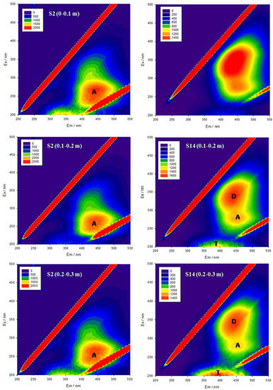 Typical 3D-EEM spectra of soil DOM of sample sitein S2 and S14.