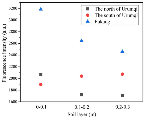 In this study, the fluorescence emission spectrum of the S2 sample was chosen to represent those of the north Urumqi region and Fukang, while the S14 sample was chosen to represent that of the south Urumqi region (Figure 2) according to the regional similarity features of the soil samples. The results of the fluorescence analysis showed similar peak shapes of obvious fluorescence peaks of A and D with a weak peak T in the soil DOM of the southern and northern regions of Urumqi and the Fukang region. It indicated that the DOM components of the farmland soil around Urumqi were mainly fulvic acids in the ultraviolet region, and there was lower content of soil humic acids and protein-like peak groups. The fluorescence peaks of the soil samples at different depths showed that there were only differences in fluorescence intensity without obvious difference in the peak types. The fluorescence intensity of the 0–0.1 m and 0.1–0.2 m soil samples was higher than that of the 0.2–0.3 m soil samples, probably due to the fact that the upper tilled layers of the soil contain a higher content of organic matter with higher fertility. Moreover, the root system of the crops is concentrated in 0–0.2 m layer, which may also lead to the higher fluorescence intensity in the upper layers of the soil than in the deeper layers. Further, comparing the mean fluorescence intensity in different regions (Figure 3), we found that the mean fluorescence intensity in Fukang was higher than that in the other two regions, and the mean fluorescence intensity in Fukang and the northern region of Urumqi was attenuated with soil depth, while the intensity in thesouthern part of Urumqi did not change significantly. This might be attributed to the fact that agricultural activities in the north part of Urumqi and the Fukang region are more intensive, with frequent interference, which led to more exogenous DOM in the soil, while the south part of Urumqi is mostly fallow land with much less interference, which might be the main cause of the relatively stable fluorescence intensity in this region.