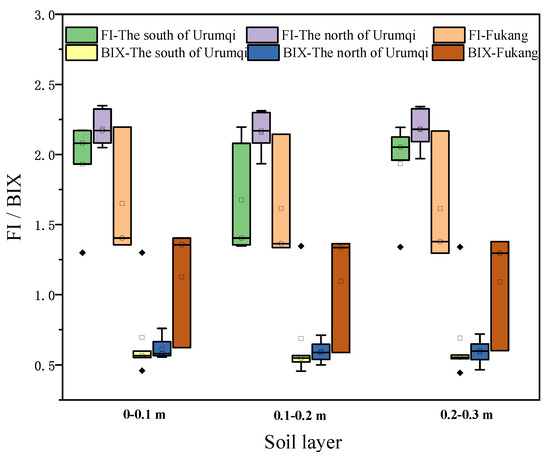 The fluorescence index (FI) often indicates the sources of DOM. Generally, there are two main sources of plant and microbial metabolites with FI values of 1.4 and 1.9, respectively [40,41]. When FI < 1.4, DOM is mainly from plant sources. When FI is between 1.4 and 1.9, DOM is from both plant and microbial metabolites. While FI > 1.9, DOM is dominated by microbial metabolite sources (such as tyrosine and tryptophan) [44]. In this study, as shown in Figure 4, the FI index of farmland soil DOM in the south of Urumqi and the north of Urumqi were almost higher than 1.9, indicating that DOM in these farmland soil samples mainly came from microbial metabolites [43]. The FI index of Fukang was greater than 1.4, indicating that the DOM source of Fukang farmland soil was not only microbial metabolites but also plant metabolites. There was no significant FI difference in different soil layers.