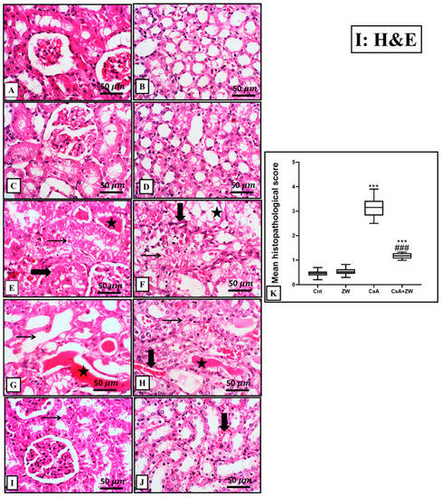 Representative photomicrograph of renal tissues from the control and experimental groups stained with H&E. (A,C) The control and ZW groups show cortical glomeruli and tubules with normal architecture. (B,D) The control and ZW groups show medullary tubules with normal histology. (E) The CsA group shows a diffuse loss of cellular detail with hypereosinophilic cytoplasm and nuclear pyknosis, karyorrhexis, and karyolysis (necrosis) (thin arrow), along with swollen, vacuolated cytoplasm with faded nuclei beside intraluminal eosinophilic globules admixed with sloughed tubular epithelial cells, necrotic debris (granular casts) (star), and proliferative glomerular capillaries (thick arrow). (F) CsA medullary tubules underwent diffuse medullary tubular necrosis (thin arrow) and vacuolation (star) with focal interstitial fibrosis (thick arrow). (G) The CsA group shows diffuse necrotic cortical tubules with a large intraluminal hyaline cast. (H) Medullary tubular sloughing (thin arrow) and intraluminal hyaline cast (star) with interstitial congestion (thick arrow). (I) The CsA + ZW group displays occasional individual tubular necrosis (thin arrow). (J) The CsA + ZW group exhibits diffuse minimal-to-mild interstitial congestion (thick arrow). (K) Histogram of the percentage area of the histological score. *** p < 0.001 vs. control; ### p < 0.001 vs. CsA. Image magnification = 400×; scale bar = 50 µm.
