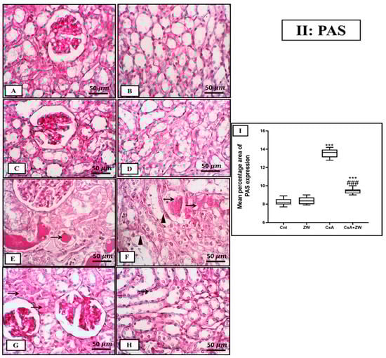 Photomicrograph of PAS expression in kidneys from control and experimental rats. (A–D) The control and ZW groups show PAS highlights of the glomerular basement membrane and tubular epithelium of the cortical and medullary region. (E,F) The CsA group shows PAS-positive staining in the dilated cortical and medullary tubules (arrowheads) with intraluminal proteinaceous globules (thin arrows). (G,H) The CsA + ZW group shows focal intracytoplasmic-positive PAS in the tubular epithelium of the cortex and the positive staining of the tubular basement membrane of medullary tubules (thin arrows). (I) Histogram of the percentage area of PAS expression. *** p < 0.001 vs. control; ### p < 0.001 vs. CsA. Image magnification = 400×, bar = 50 µm.