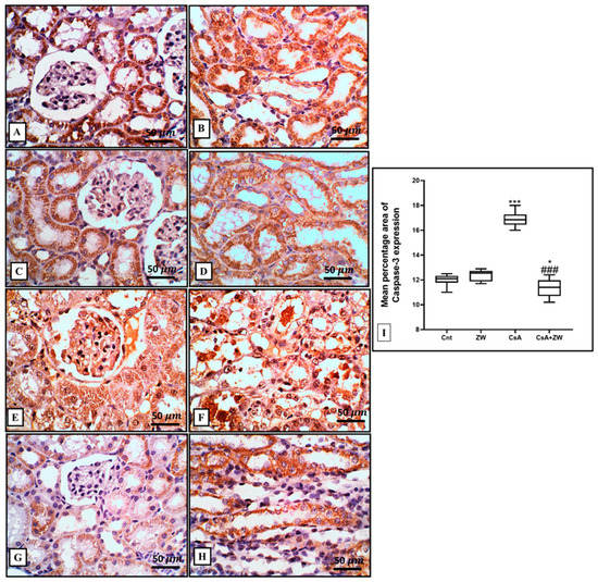 Immunohistochemical analysis of caspase-3 expression and localization in the kidney. (A–D) The control and ZW groups show cytoplasmic expression in the normal cortical and medullary tubular epithelium. (E,F) The CsA group shows diffuse, strong expression in the glomerulus, in the cytoplasm of necrotic and vacuolated cortical and medullary tubular cells, and in the cytoplasm of vacuolated and intraluminal cells. (G,H) The CsA + ZW group shows moderate cortical and medullary tubular expression. (I) Kidney caspase 3 histogram. *** p < 0.001, and * p < 0.05 vs. control; ### p < 0.001 vs. CsA. Image magnification = 400×; scale bar = 50 µm.