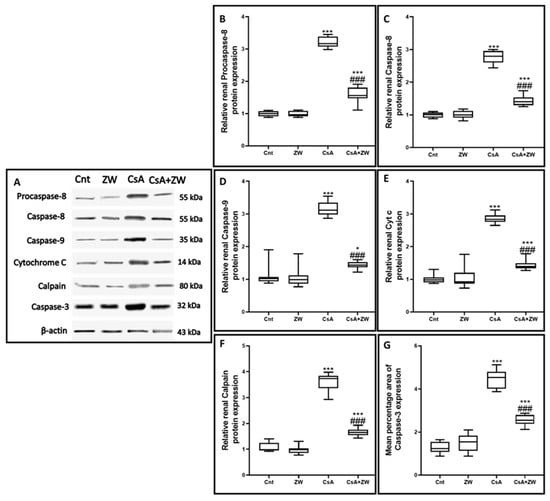 The effect of ZW on the expression of the proteins (A,B) procaspase-8, (A,C) caspase-8, (A,D) capase-9, (A,E) cytochrome C, (A,F) calpain, and (A,G) caspase-3 according to Western blotting assay. *** p < 0.001, and * p < 0.05 vs. control; ### p < 0.001 vs. CsA.
