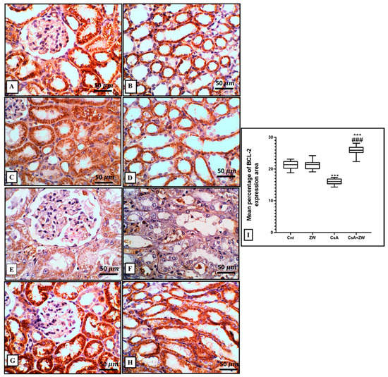 Representative Bcl2-immunohistochemistry of the kidney. (A–D) The control and ZW groups show diffuse strong expression in the normal cortical and medullary tubular epithelium. (E,F) The CsA group shows diffuse moderate expression in necrotic, sloughed tubular cells and in the cytoplasm of vacuolated and intraluminal cells. (G,H) The CsA + ZW group shows diffuse strong Bcl-2 expression in the cortical and medullary tubules. (I) Histogram of the percentage area of immunostaining of renal Bcl-2, *** p < 0.001 vs. control; ### p < 0.001 vs. CsA. Image magnification = 400×; bar = 50 µm.