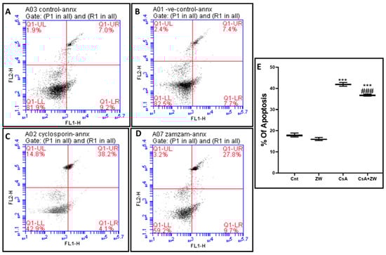 Flow cytometry analysis of renal tubular cells stained with the apoptotic marker Annexin V as an indifferent experimental group. (A) Control group, (B) ZW group, (C) CsA group, and (D) CsA + ZW group. (E) Histogram of apoptotic cells. *** p < 0.001 vs. control; ### p < 0.001 vs. CsA.