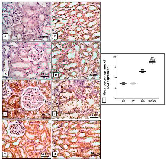 Representative immunohistochemical assessment of LC3 expression in the kidney. (A–D) The control and ZW groups show none-to-few faint expressions in cortical tubules without glomerular expression and diffuse expression in the cytoplasm of medullary tubules. (E,F) The CsA group shows diffuse strong expression in the cytoplasm of necrotic, sloughed, and vacuolated cortical cells, with few glomerular expressions and a lower expression in medullary tubular cells (intraluminal sloughed cells and intraluminal cast). (G,H) The CsA+ ZW group shows diffuse cortical and medullary tubular expression with low glomerular expression. (I) Histogram of the percentage area of the immunostaining of renal LC3. *** p < 0.001 vs. control; ### p < 0.001 vs. CsA. Image magnification = 400×; scale bar = 50 µm.