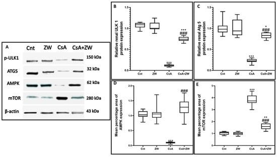 Influence of ZW on the protein expression of (A,B) P UlK-1, (A,C) Atg5, (A,D) AMPK, and (A,E) mTOR proteins according to Western blotting assay. *** p < 0.001, ** p < 0.001, and * p < 0.05 vs. control; ### p < 0.001vs. CsA.