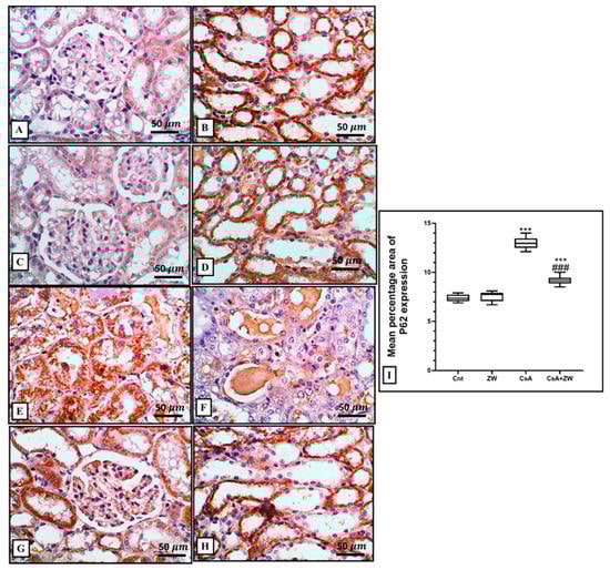 Bax immunohistochemistry of the kidney. (A–D) The control and ZW groups show faint cytoplasmic Bax expression in normal cortical and medullary tubules. (E,F) The CsA group shows diffuse severe and strong Bax expression in the cytoplasm of necrotic, sloughed tubular cells and vacuolated cells. (G,H) The CsA + ZW group shows diffuse moderate Bax expression in cortical and medullary tubules. (I) Histogram of the percentage area of the immunostaining of renal Bax. *** p <0.001 vs. control; ### p < 0.001vs. CsA. Image magnification = 400×; scale bar = 50 µm.