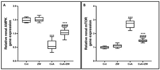The effect of ZW treatment on the expression of the (A) AMPK and (B) mTOR genes in various groups. *** p < 0.001 vs. control; ### p < 0.001 vs. CsA.