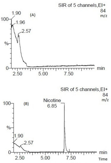 In the case of vaping liquids, nicotine is present in a matrix most commonly consisting of propylene glycol and vegetable glycerin. GC-MS is considered to be a powerful analytical technique to quantify nicotine in tobacco products. However, this technique, when used to quantify low levels of analyte in complex mixtures, may result in signal suppression, enhancement and interference due to matrix effects. In the initial stage of method development, strong matrix interferences were observed with respect to absolute nicotine responses (Figure S1).