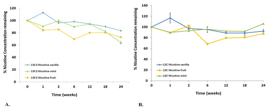 (A). Stability of 13C3 nicotine; (B). Stability of 12C nicotine in three lots each: vanilla, mint and fruit vaping products.