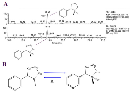 (A). Extracted ion chromatograms of (1′S 2′S) nicotine-1′-oxide (m/z 178) and (1′S 2′S) 13C3 nicotine-1′-oxide (m/z 181); (B). Degradation and thermal rearrangement of 13C3 nicotine to (1′S 2′S) 13C3 nicotine-1′-oxide.