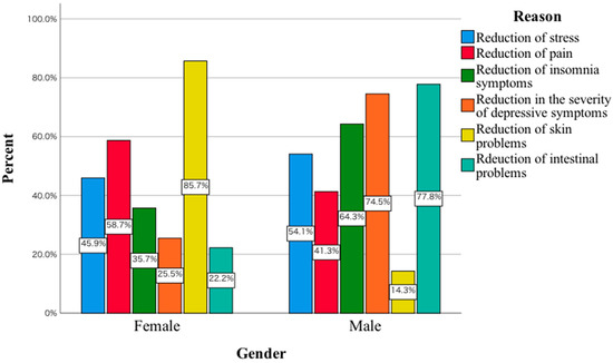 A statistically significant relationship was observed between the gender of the subjects and the reason for their consumption of Amanita muscaria, χ2(5) = 24.45; p < 0.001; Vcr = 0.31. In the group of women surveyed, compared to men, a greater proportion said they consumed Amanita muscaria to reduce the severity of pain, as well as to reduce skin problems. In men, these were primarily for reasons such as stress relief, a reduction in the severity of depressive symptoms, as well as a reduction in insomnia (Figure 1).