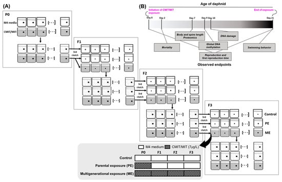 Considering the widespread use of CMIT/MIT and its continuous detection in surface waters [], it is necessary to evaluate the impact of CMIT/MIT on aquatic ecosystems using keystone species over multiple generations. Herein, we investigated the toxicity of CMIT/MIT to Daphnia magna under two exposure scenarios (i.e., only parental exposure and recovery (PE) vs. exposure of four consecutive generations; multigenerational exposure (ME)) by measuring phenotypic biomarkers, DNA damage, and global DNA methylation over four consecutive generations.