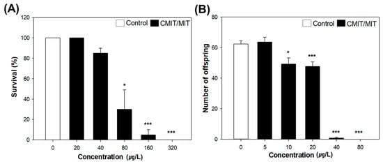 Effects of CMIT/MIT on mortality and reproductive capacity in D. magna: (A) Survival rate of daphnid neonates exposed for 48 h to 20, 40, 80, 160, and 320 µg/L CMIT/MIT. Data are presented as means ± SE (n = 4). (B) Total offspring numbers of adult daphnids exposed for 21 days to 5, 10, 20, 40, and 80 µg/L CMIT/MIT. Data are presented as means ± SE (n = 10). Asterisks indicate the significant differences between the exposure and control groups: * p < 0.05 and *** p < 0.001.