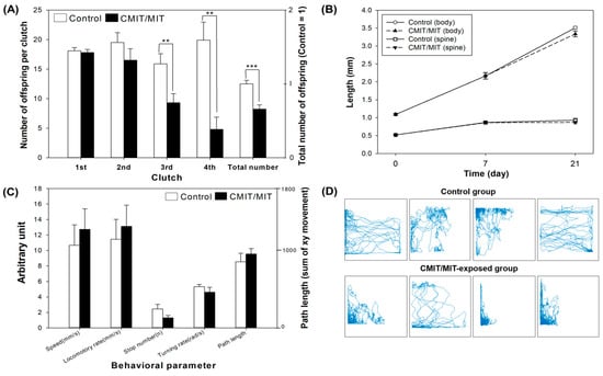 Reproductive capacity, growth, and swimming behavior of D. magna after exposure to EC20 CMIT/MIT (7 µg/L): (A) Number of offspring per clutch and total number of offspring produced by adult daphnids exposed to CMIT/MIT for 21 days. (B) Growth of daphnids was observed on days 0, 7, and 21 after exposure to CMIT/MIT. (C) The quantitative value of behavioral parameters (speed, locomotory rate, stop number, turning rate, and path length). (D) The representative pictures of two-dimensional pathway (four images were selected) in the control and exposure groups. Data are presented as means ± SE (n = 10), with the asterisks indicating significant differences between the exposure and control groups: ** p < 0.01 and *** p < 0.001.