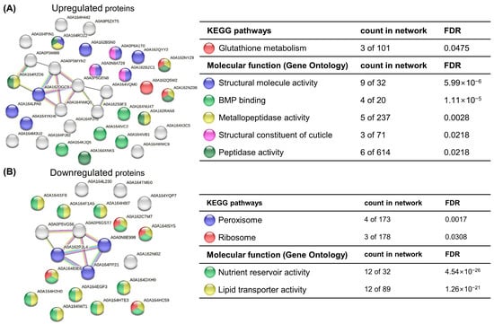 Protein–protein interaction networks and functional enrichments of differentially expressed proteins (DEPs) in D. magna after exposure to EC20 CMIT/MIT: KEGG pathways and GO molecular functions were enriched among (A) upregulated proteins and (B) downregulated proteins.