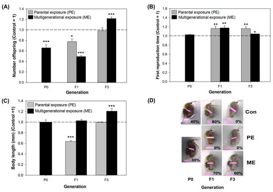 Rafoth et al. highlighted that CMIT and MIT in river water and tap water completely degraded within eight days and that the concentration decline at 4 °C significantly slowed []. Despite the short half-life, this duration is sufficient to affect the daphnid populations over multiple generations. Therefore, after confirming the significant adverse effects of CMIT/MIT on D. magna, we investigated the trans- and multigenerational effects of CMIT/MIT. To investigate whether phenotypes are either retained or changed when recovery time is given or exposure continues, we adopted two types of exposure scenarios: parental generation exposure with recovery of three further generations (parental exposure, PE) and consecutive exposure over four generations (multigenerational exposure, ME). The responses of the daphnids were compared for each generation using reproductive capacity, body size, and morphology endpoints. In the P0 generation, a significant effect of CMIT/MIT was observed on offspring number per female organism (decreased by 34.2%), but not on reproduction time. However, the PE group gradually improved in offspring number (decreased by 23.5% and 1.5%) and showed a delayed first reproduction time (increased by 16.7% and 16.3%, respectively) across generations (Figure 5A,B). In contrast to PE, the most severe effects were manifested in the number of neonates and first reproduction time (decreased by 51.5% and increased by 17.8%, respectively) in the F1 generation of the ME group, whereas beneficial effects (increased by 21.5% and 4.7%, respectively) were observed in the F3 generation (Figure 5).