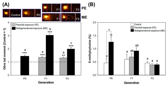 Genotoxic and epigenetic responses of daphnids to parental and multigenerational exposure to EC20 CMIT/MIT: (A) Comparison of the measured DNA damage with the representative images of tail moment. (B) Comparison of % global DNA methylation. Asterisks indicate significant differences between the exposure and control groups: * p < 0.05, ** p < 0.01, and *** p < 0.001. Letters denote the homogeneity between groups (Bonferroni’s test).