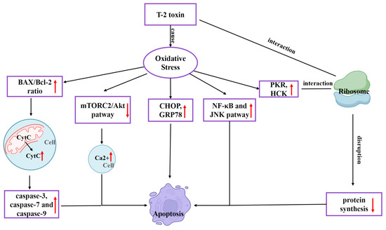 T-2 toxin undergoes metabolism to form epoxides, which are highly poisonous substances that react with nucleophiles and encourage the creation of reactive oxygen species (ROS). Oxidative stress in the body is further exacerbated by excessive ROS. The 60S ribosomal subunit’s peptidyl transferase can be affected by T-2 toxin, limiting the synthesis of peptide bonds and proteins [19]. Numerous studies have shown that T-2 toxin-generated ROS is the primary cause of harm in broiler and rabbit hepatocytes [20,21], bovine Leydig cells [22], rat ovarian granulosa cells [23], mouse kidneys [24], and mouse PC12 cells [18]. Consequently, it is widely accepted that oxidative stress is the primary reason for T-2 toxin’s toxicity. While several pathogenic changes, such as autophagy, endoplasmic reticulum stress (ERS), mitochondrial damage, inflammatory response and ribosome stress all have oxidative stress as their upstream cause, the final process of these pathological changes is attributed to cell death [25,26]. Increased free Ca2+ concentration, DNA methylation, the rapamycin 2 (mTORC2)/Akt pathway, the ERS-related pathway, and the caspase-mediated mitochondrial apoptosis pathway are possible cell-death processes [9]. T-2 toxin causes mitochondrial apoptosis in chicken flesh hepatocytes. By producing ROS, raising the BAX/BCL-2 ratio, and moving the apoptosis pigment C (CytC) from the mitochondria to the cytoplasm, CytC stimulates the activation of caspase-3, caspase-7 and caspase-9 [27]. In mouse TM3 Leydig cells, T-2 toxin can block the mTORC2/Akt pathway by generating ROS, raising the intracellular free Ca2+ concentration, and leading to apoptosis [28]. By generating ROS, T-2 toxin can stimulate the expression of RNA-activated protein kinase R (PKR) and hematopoietic cell kinase (HCK). PKR and HCK act on ribosomes to cause ribotoxic stress response, which subsequently induces apoptosis [9]. The NF-κB inflammatory pathway and c-jun N-terminal kinase (JNK) pathway are triggered, and the synthesis of inflammatory mediators (TNF-, IL-1, and IL-6) is greatly elevated in the body by T-2 toxin-caused oxidative stress. At the same time, the expression of ERS indicators CHOP and GRP78 involved in apoptosis increases, followed by apoptosis [29]. T-2 toxin toxicity mechanism is illustrated in Figure 1.