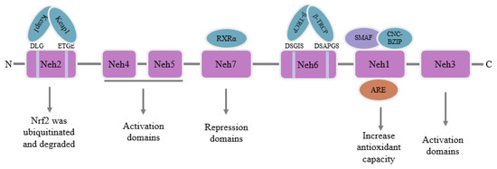Nuclear factor E2-related factor 2 (Nrf2), a transcription factor belonging to the Cap’n’Collar (CNC) family [30], includes seven Nrf2-ECH homeodomains (Neh), Neh1-Neh7 [31]. The Neh1 domain is situated at the C-terminal region of Nrf2 and is crucial for regulating Nrf2 activity. Neh1 and small musculoaponeurotic fibrosarcoma proteins (sMAF) can combine to create a dimer through the CNC basic region leucine zipper (CNC-bZIP) structure. The dimer helps Nrf2 recognize and bind to the antioxidant response element (ARE) sequence in nuclear DNA, and then stimulates Nrf2 to initiate the transcription of phase II detoxification enzyme genes or antioxidant enzyme genes to improve the antioxidant capacity of the body [32]. The Neh2 domain is situated at the N-terminal zone of Nrf2, which contains highly conserved sequences of DLG and ETGE and specifically binds to Kelch-like ECH-associated protein 1 (Keap1). After binding, it mediates Nrf2 ubiquitination and degradation in the cytoplasm [33]. The Neh3 domain is also situated at the C-terminal region of Nrf2 and binds to the pigment atpase/helicase DNA binding protein 6 to activate and adjust Nrf2 target gene transcription activity [34]. The Neh4 and Neh5 can cooperate with Neh3 to promote Nrf2 activation [35]. The Neh6 domain mainly contains highly conserved sequences of DSGIS and DSAPGS, which bind to E3 ubiquitin ligase β-transducin repeats-containing proteins (β-TRCP). After binding, the domain mediates the degradation of Nrf2 in oxidative stress cells [36]. Neh7 inhibits the transcription of Nrf2 target genes by interacting with the retinoic X receptor α (RXRα) [37]. A conceptual representation of Nrf2’s structure is depicted in Figure 2.