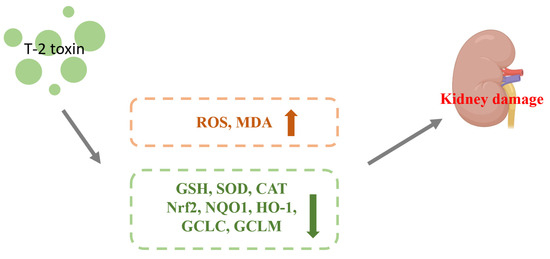 Zhang et al. gavaged mice with 0.5, 1, and 2 mg/kg BW of T-2 toxin for 28 d and found that the levels of ROS and the lipid peroxidation end product malondialdehyde (MDA) were increased, while the level of glutathione (GSH) and SOD and CAT activities were decreased by T-2 toxin in the kidney, resulting in renal oxidative stress in the mice. T-2 toxin increased the expression of the Nrf2 protein and its downstream target genes (NQO1, HO-1, SOD, CAT, GCLC, and GCLM), indicating that the Nrf2 molecule was activated in the kidney. Meanwhile, correlation analysis was used to compare oxidative stress and Nrf2 pathways. The expression of Nrf2 and its downstream target genes in the renal tissues were demonstrated to positively correlate with ROS and MDA contents and negatively correlate with GSH content and SOD and CAT activities, indicating that activated Nrf2 is involved in the oxidative stress caused by T-2 toxin. Results revealed that the kidney may activate Nrf2 and boost the expression index of its downstream target genes (NQO1, HO-1, SOD, CAT, and GCLM) in response to T-2 toxin damage to the kidney. This would counteract the renal oxidative stress brought on by T-2 toxin [26]. The mechanism of T-2 toxin-induced nephrotoxicity is shown in Figure 3.