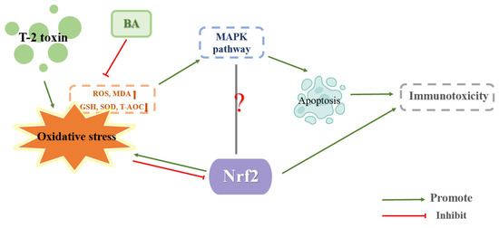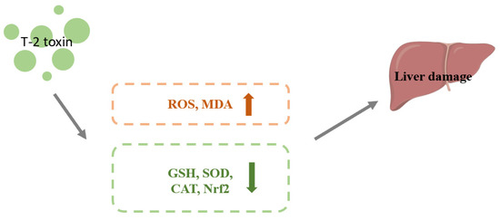 Benjamin et al. conducted an oral administration of 1.82 mg/kg BW T-2 toxin to carp juveniles and removed the liver for analysis after 0, 8, 16, or 24 h. T-2 toxin enhanced the amount of ROS and MDA and decreased GSH content and Nrf2 protein expression. This discovery suggested a possible link between T-2 toxin-induced oxidative stress in the liver of juvenile carp and the suppression of Nrf2 expression. The liver is the largest digestive gland and detoxification organ in the body. The function of Nrf2 in T-2 toxin-induced hepatotoxicity is not entirely understood, so more research is required to shed light on this issue [58]. The mechanism of T-2 toxin-induced hepatotoxicity is shown in Figure 4.