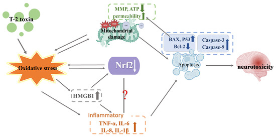 Mechanism of neurotoxicity induced by T-2 toxin. T-2 toxins cause oxidative stress. Oxidative stress leads to mitochondrial damage (decreased MMP and ATP content, increased mitochondrial permeability, ROS production and increased cytochrome exudation), and mitochondrial damage leads to apoptosis (increased expression of caspase-3, caspase-9, BAX and P53, decreased expression of Bcl-2), which results in neurotoxicity. Increased expression of BAX and P53 exacerbates mitochondrial damage, and ROS produced by mitochondrial damage further increases oxidative stress. Oxidative stress leads to decreased Nrf2 expression, which in turn exacerbates oxidative stress. Oxidative stress leads to increased expression of HMGB1, which in turn leads to decreased expression of Nrf2 and increased expression of inflammatory factors (TNF-α, IL-6, IL-8 and IL-1β), and increased expression of inflammatory factors promotes cell apoptosis. Oxidative stress leads to increased expression of inflammatory factors. The relationship between Nrf2 and inflammation is unclear.