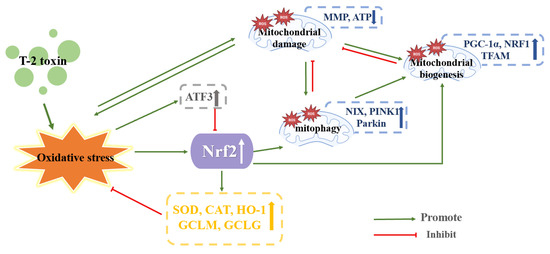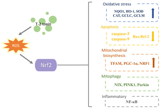 A current line of research on Nrf2 in T-2 toxin toxicity. T-2 toxin causes oxidative stress which affects Nrf2 expression. Nrf2 can increase anti-oxidative stress indicators, reduce apoptosis indicators, increase mitochondrial biogenesis indicators, affect autophagy indicators and affect inflammatory indicators.