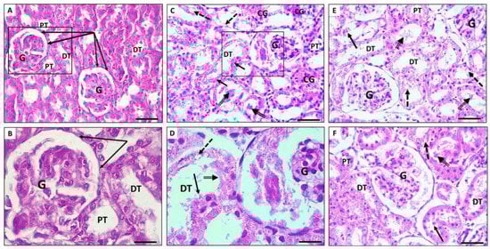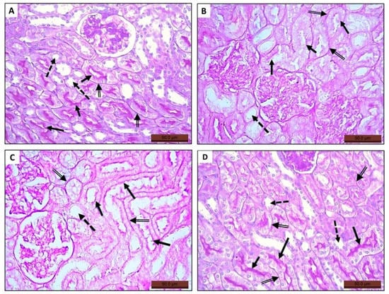 - El-Agawy, M.S.E.-D.; Badawy, A.M.M.; Rabei, M.R.; Elshaer, M.M.A.; El Nashar, E.M.; Alghamdi, M.A.; Alshehri, M.A.; Elsayed, H.R.H. Methotrexate-Induced Alteration of Renal Aquaporins 1 and 2, Oxidative Stress and Tubular Apoptosis Can Be Attenuated by Omega-3 Fatty Acids Supplementation. Int. J. Mol. Sci. 2022, 23, 12794. [Google Scholar] [CrossRef]
