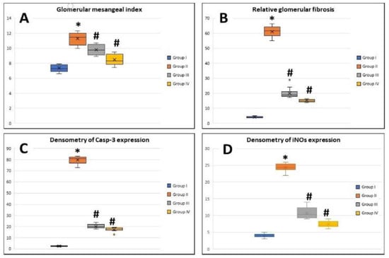 - Optical density of Casp-3 and iNOS immunohistochemically stained sections. After subtracting the background noise, six non overlapping fields from each sample were used to calculate the average positive Casp-3 and iNOS immunoactivity [37].