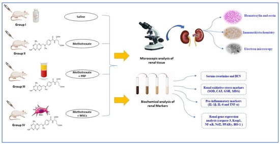 - Gad, A.M.; Hassan, W.A.; Fikry, E.M. Significant curative functions of the mesenchymal stem cells on methotrexate-induced kidney and liver injuries in rats. J. Biochem. Mol. Toxicol. 2017, 31, e21919. [Google Scholar] [CrossRef] [PubMed]