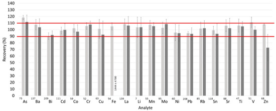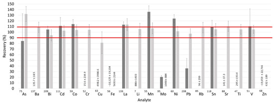 Elements with unacceptable recovery values are shown in Figure 1. Some of these elements may experience spectral interferences caused by ions with the same mass as the analyte ions (Table 1). These spectral interferences could be induced by polyatomic ions originating from the plasma gas or matrix components. For instance, the presence of chloride in the samples could lead to the spectral overlap of 35Cl40Ar on the 75As isotope [30]. To mitigate spectral interferences, a collision cell positioned before the analyzer quadrupole could be employed. The basic concept involves using a non-reactive gas, such as He, to stimulate ion–molecule collisions, as polyatomic ions have a larger ionic cross-section area than analyte ions with the same mass-to-charge ratio, thereby promoting collisions between He atoms and polyatomic ions.