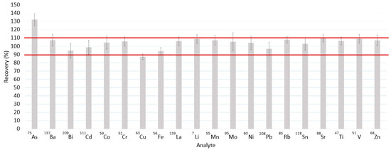 The recoveries calculated using Equation (3) deviated from 100% for many analytes (75As, 137Ba, 52Cr, 63Cu, 56Fe, 7Li, 55Mn, 95Mo, 60Ni, 208Pb, 85Rb, 88Sr, 47Ti, and 68Zn) when a 1:2 dilution factor was applied, as shown in Figure 1. The recoveries for 75As, 52Cr, 56Fe, 95Mo, 208Pb, and 68Zn were below 100%, while for 63Cu, 137Ba, 7Li, 55Mn, 60Ni, 88Sr, and 47Ti the recoveries were above 100%. The impact of matrix effects was reduced when a higher dilution factor (1:4) was used (Figure 1). A tolerance interval of ±10% was established, with good recoveries lying within the range of 90–110%. The recoveries for 137Ba, 111Cd, 59Co, 52Cr, 7Li, 55Mn, 60Ni, 208Pb, 85Rb, 118Sn, 88Sr, 47Ti, and 51V were within this interval. However, the recoveries obtained for 75As, 63Cu, 56Fe, 95Mo, and 68Zn were outside of the tolerance interval. The recovery for 63Cu was below 100%, while for 75As, 56Fe, 95Mo, and 68Zn it was above 100%. Therefore, the 1:4 dilution factor was selected.