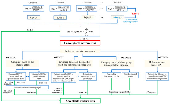 Proposed scheme for the assessment of human health risk from combined exposure to multiple chemicals based on currently available methodologies and options. HBGV: Health-Based Guidance Value, RQ = Risk Quotient, RQi: Risk Quotient for individual mixture components, mRQ: mitigated Risk Quotient, RQSum: Risk Quotient for the mixture, n = number of mixture components, i = a mixture component, HI: Hazard Index, RPI: Reference Point Index, mRPI: modified Reference Point Index, MOET: Margin Of Exposure Total (combined), HBM-GVspecific: Human BioMonitoring—Guidance Value for specific population group, MAF: Mixture Allocation Factor, RQSUM(MAF): Risk Quotient for the mixture adjusted using MAF. α: [111]; β: [112]; γ: [36]; δ: [37]; ε: [113], ζ: [114]; η: [115]; θ: [116].