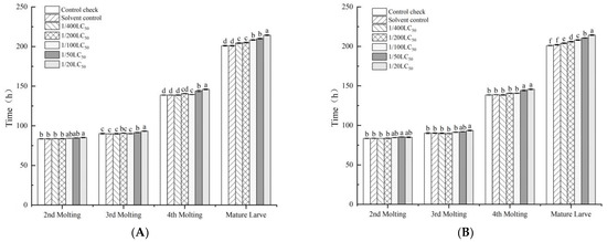 Effect of the leaf-dipping method with imidacloprid and thiamethoxam on the silkworm developmental period. (A) imidacloprid; (B) thiamethoxam. Note: Values are means (±SEM) of the time spent in each molting by the leaf-dipping method. Significant differences are represented between different letters according to the least significant difference (LSD) method (p < 0.05).