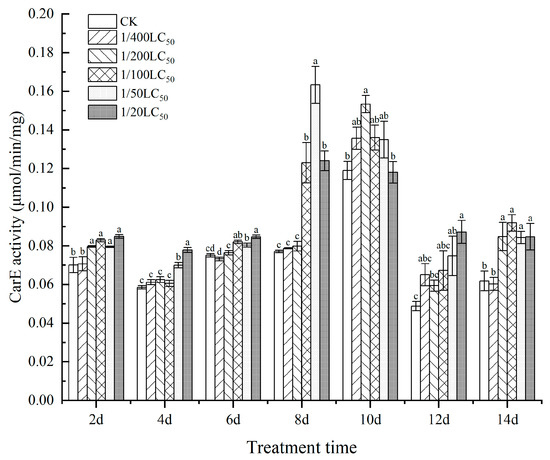 Moreover, the CarE activity of the 1/50 LC50 group was 2.12-fold that of the CK group on day 8. Moreover, on day 10, the CarE activity of the 1/200 LC50 group was 1.29-fold that of the CK group. The results indicated that low concentrations of thiamethoxam could influence CarE and GST activities.
